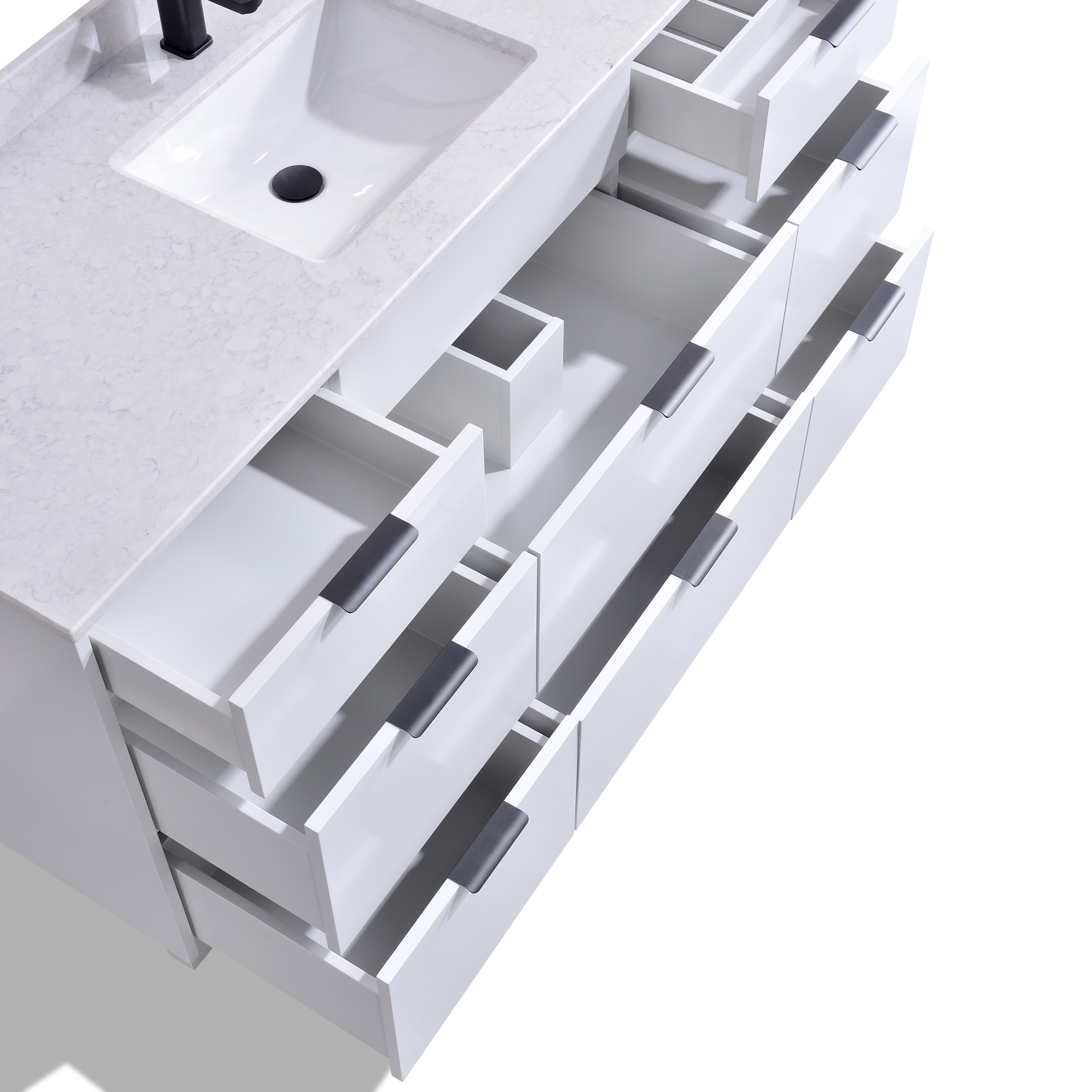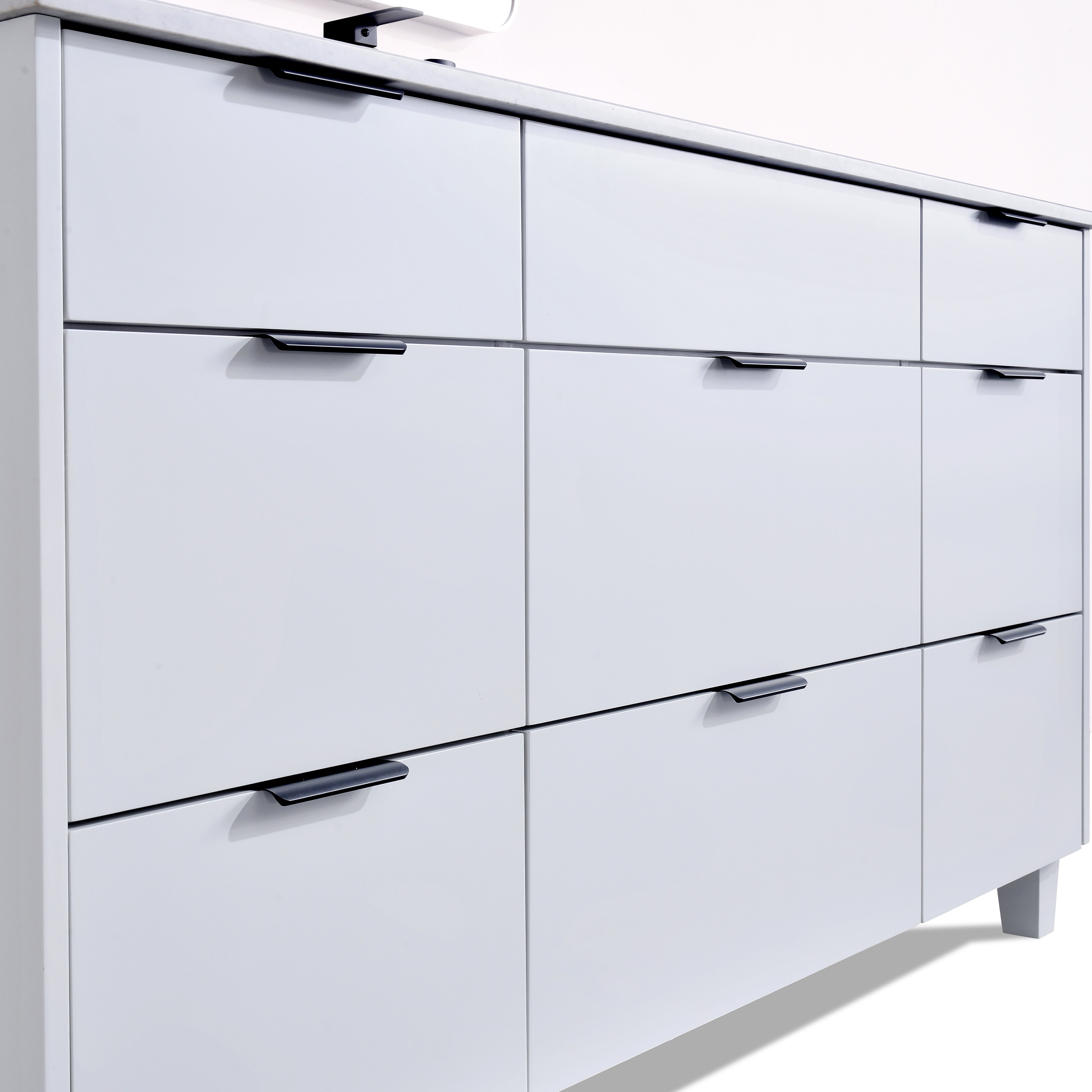 Sleek Modern Design with Black Hardware: Seamless drawer fronts paired with refined black pulls create a crisp, contemporary look. The clean lines and minimalist detailing make this vanity a perfect fit for modern bathrooms while remaining versatile enough for transitional spaces.