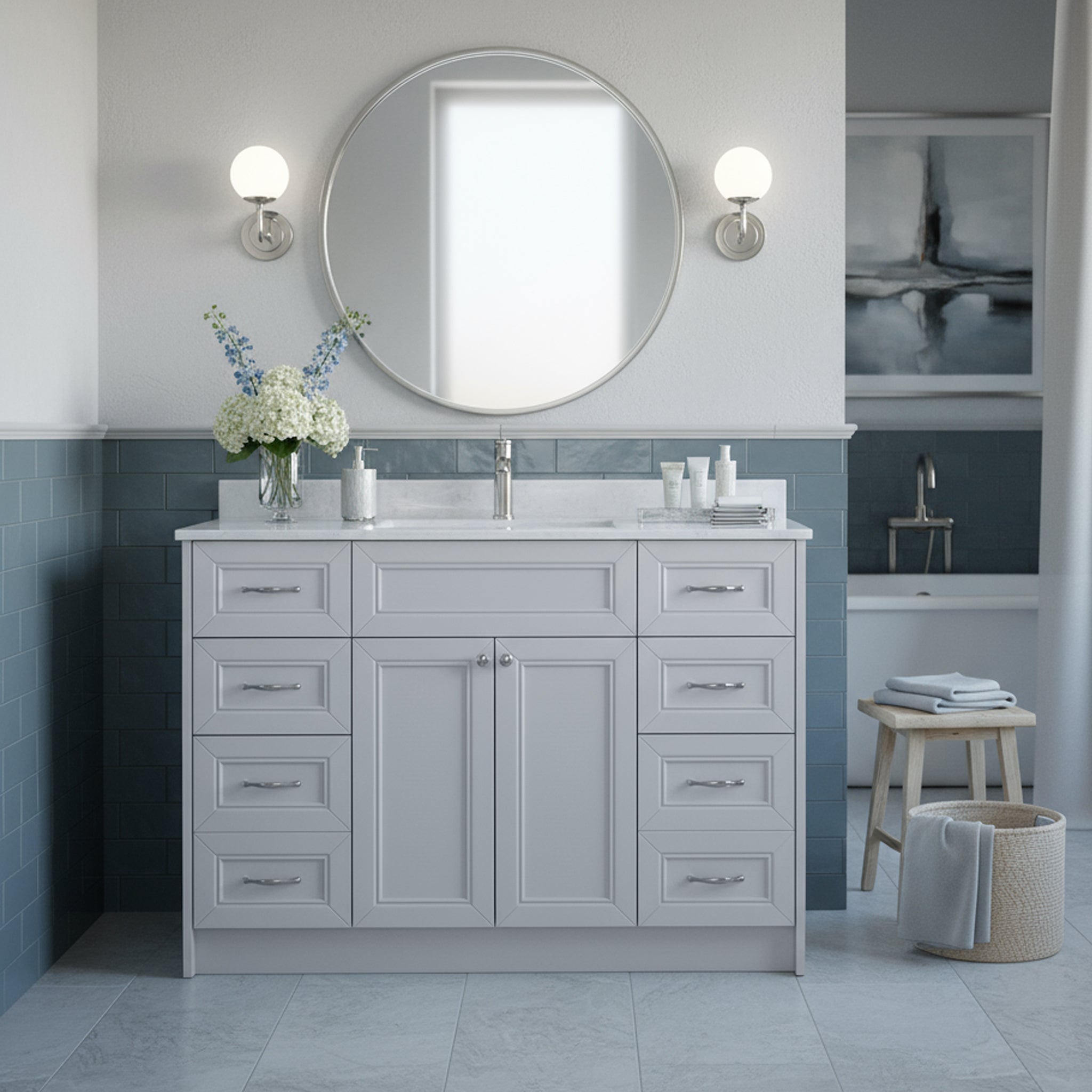 Timeless Shaker-Style Design: Elegant gray cabinetry, clean lines, and brushed hardware create a versatile look that complements both modern and traditional bathrooms. A timeless design that won’t go out of style.