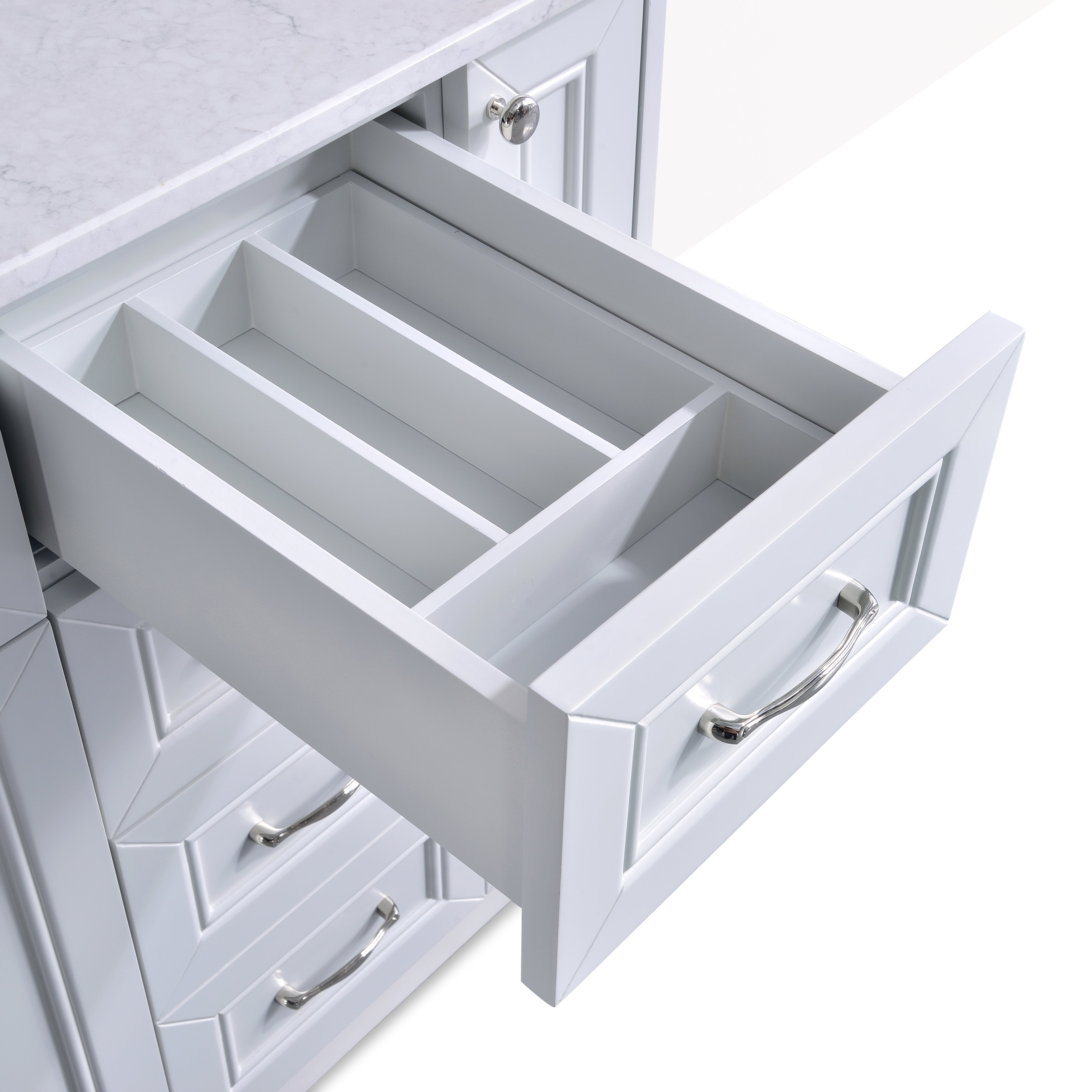 Smart Storage for Everyday Living: Multiple soft-close drawers and spacious cabinets keep everyday essentials organized and within reach. The smart layout maximizes storage without compromising on style or accessibility.