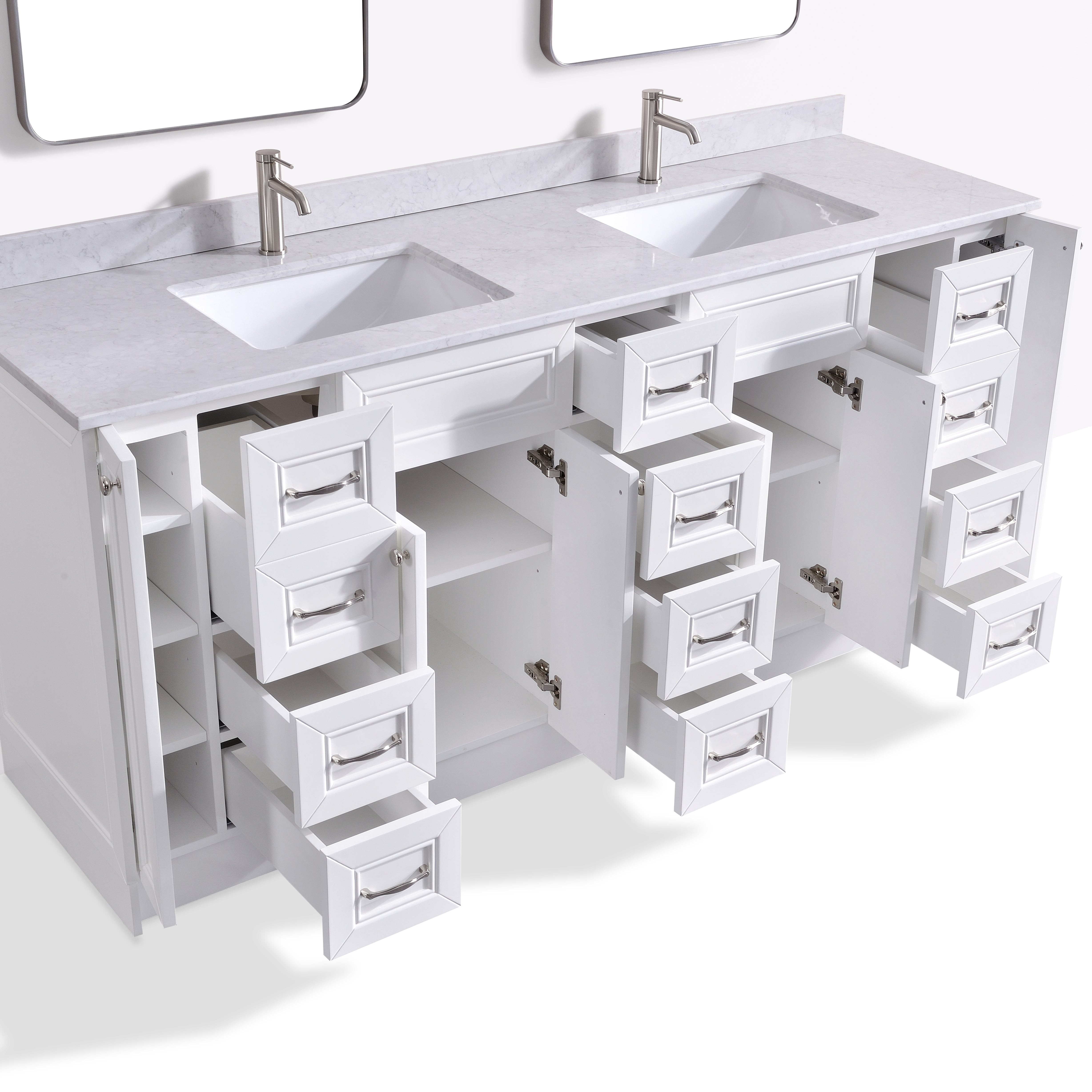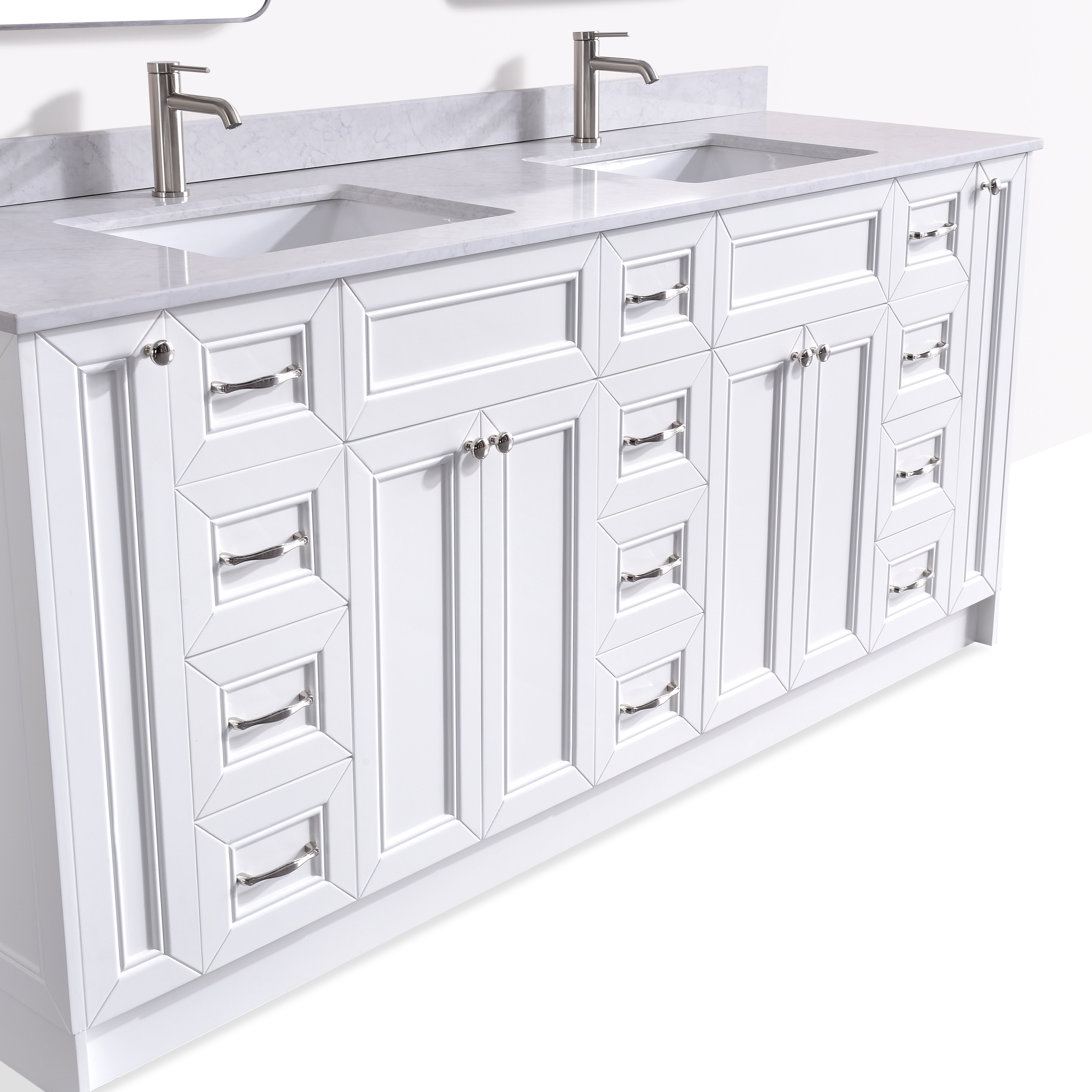 Featuring classic shaker-style doors and stylish hardware, the Magna vanity is a refreshed take on a timeless design. Solid wood cabinetry crowned with the stunning swirls of the Tuscan quartz countertop creates a luxurious look and feel. This vanity also features European soft-closing hardware, providing for a refined experience.
